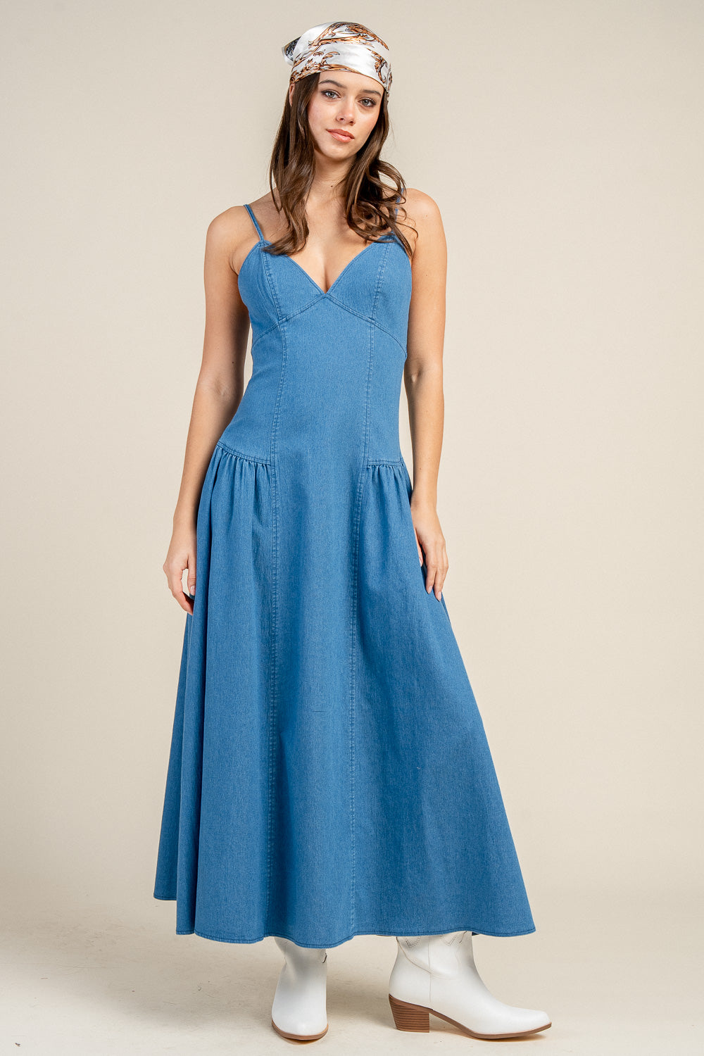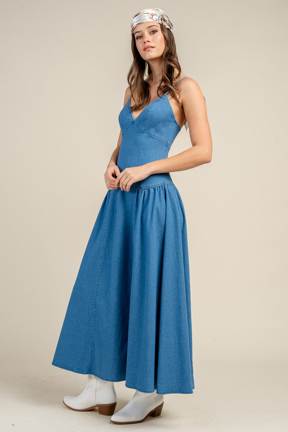 CHAMBRAY DENIM SPURGE NECK MAXI DRESS