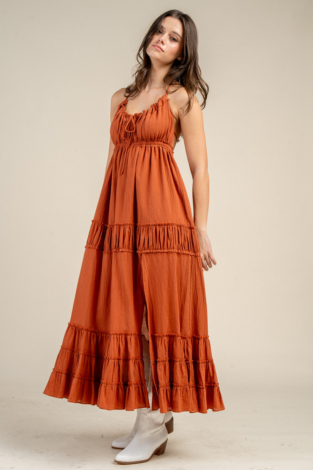 • Tiered maxi silhouette with ruffle trim for added movement