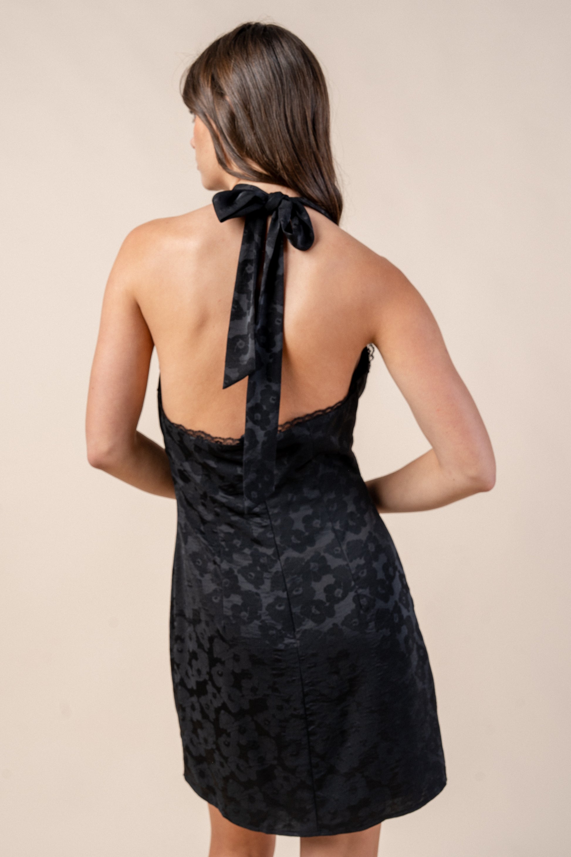• Halter-style neckline with a plunging V and delicate trim