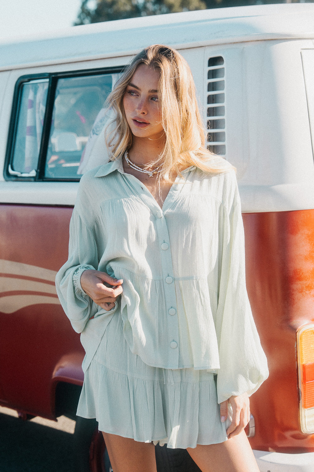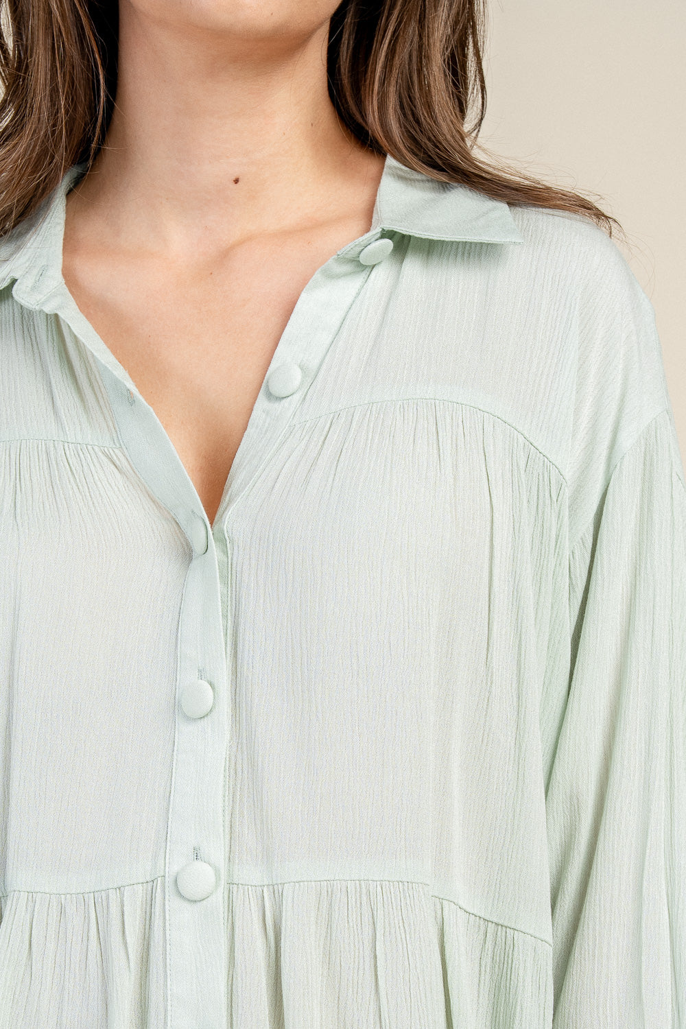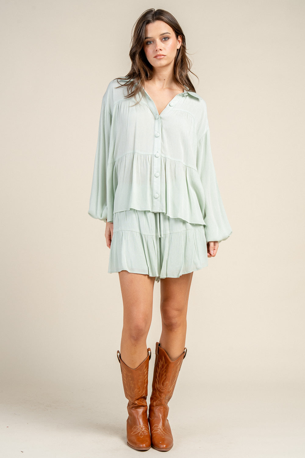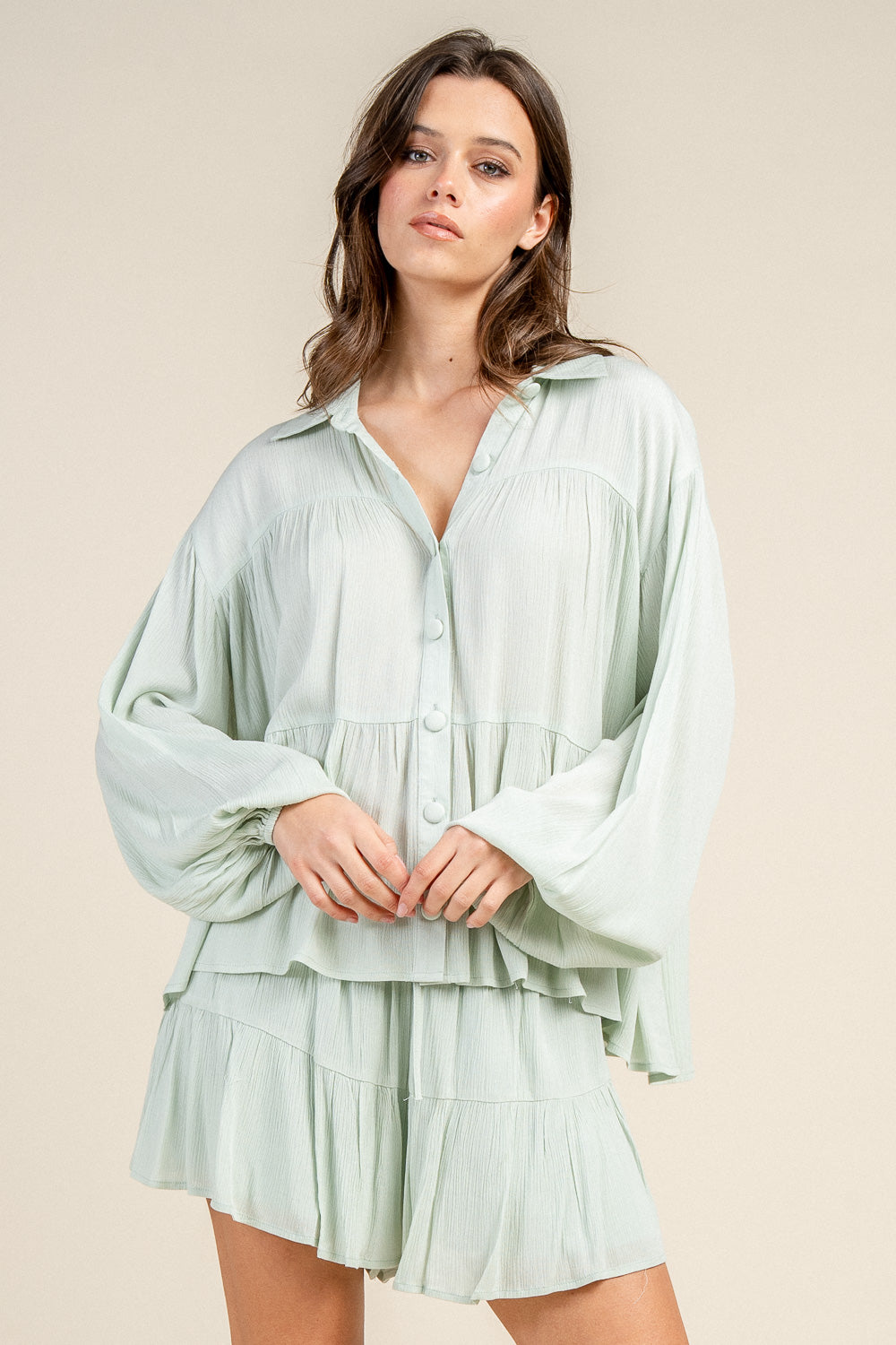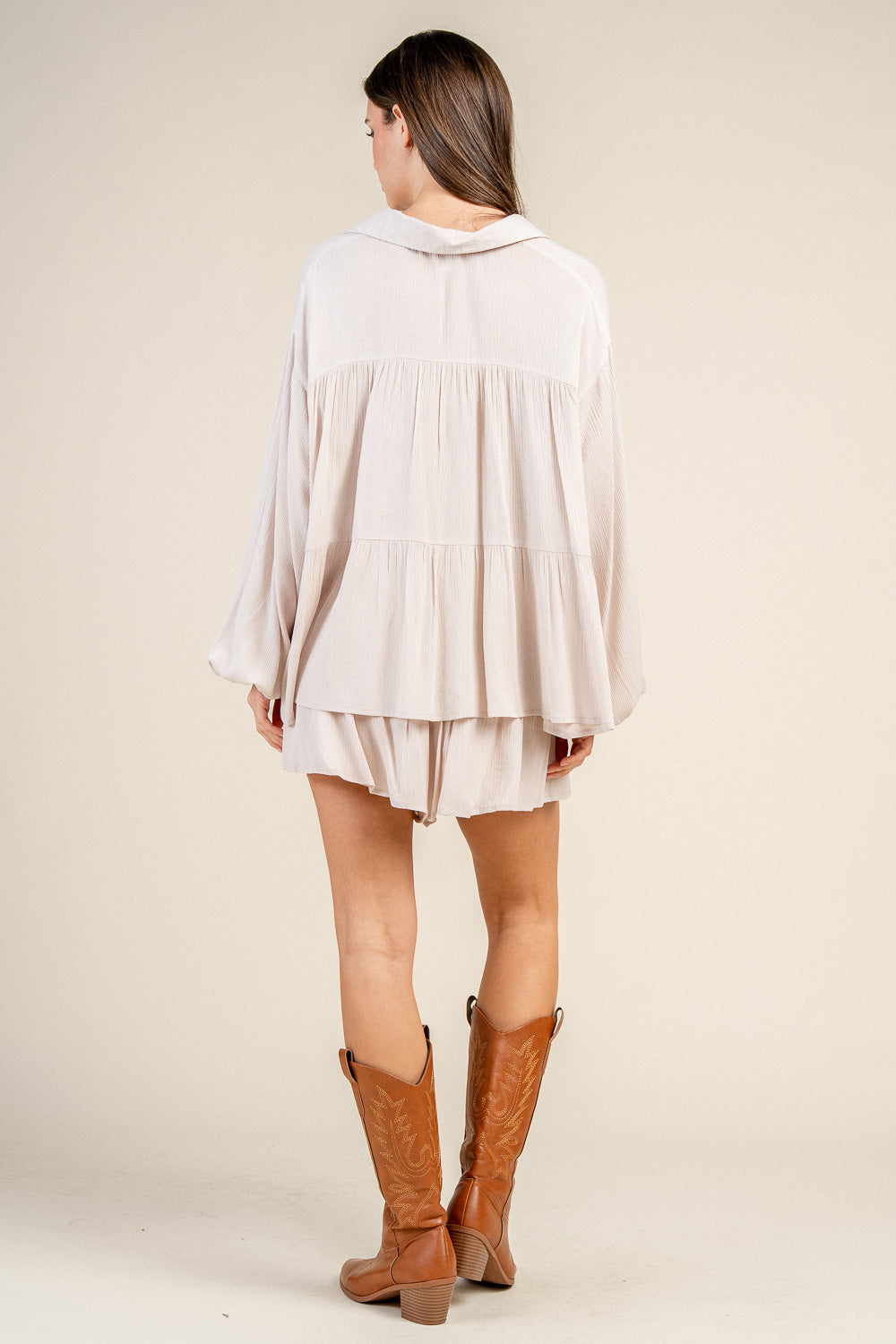 OVERSIZED BUTTON DOWN BLOUSE W/ TIERED PANEL, TIERED SHORTS W/ ELASTIC WAIST