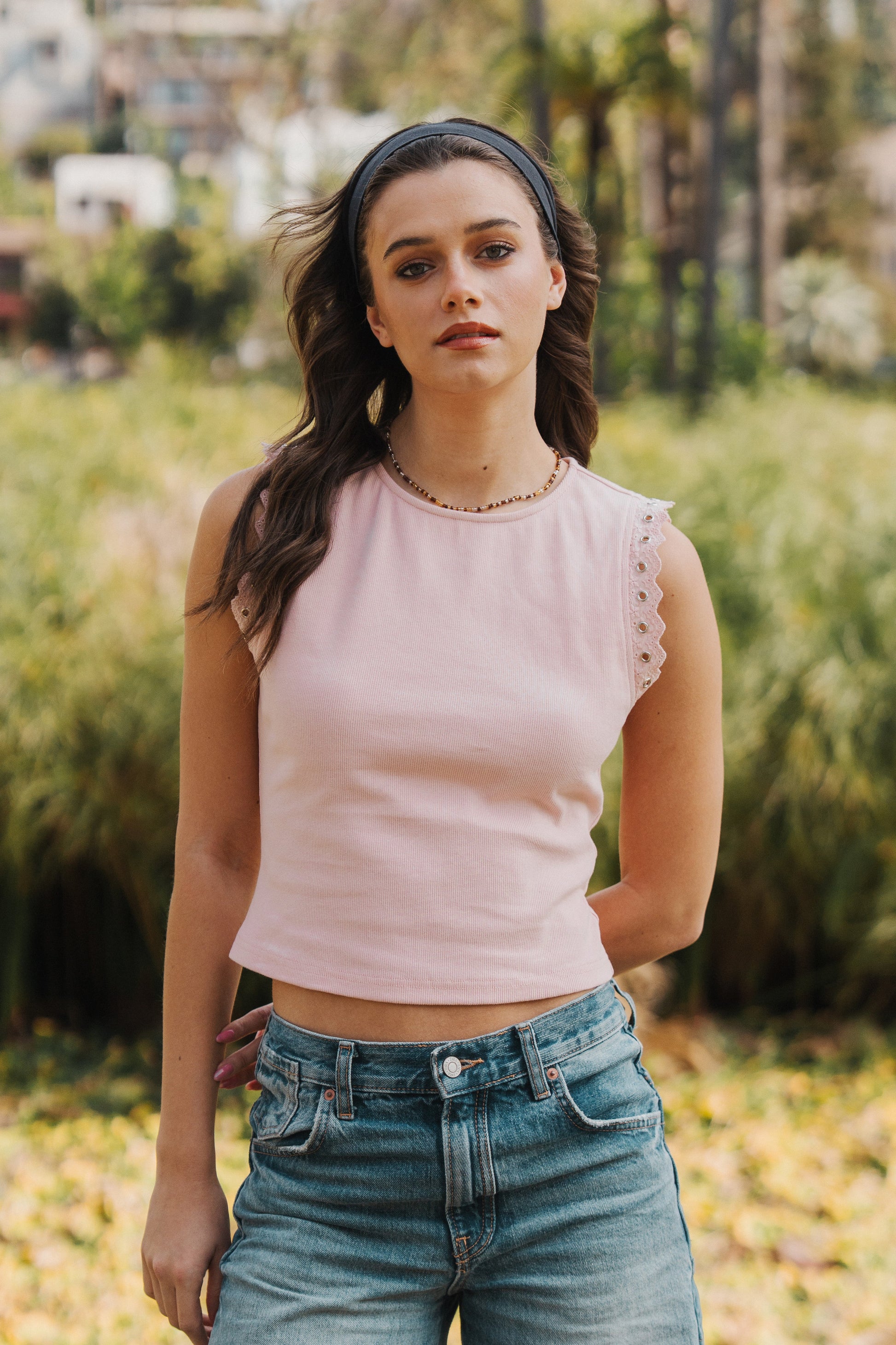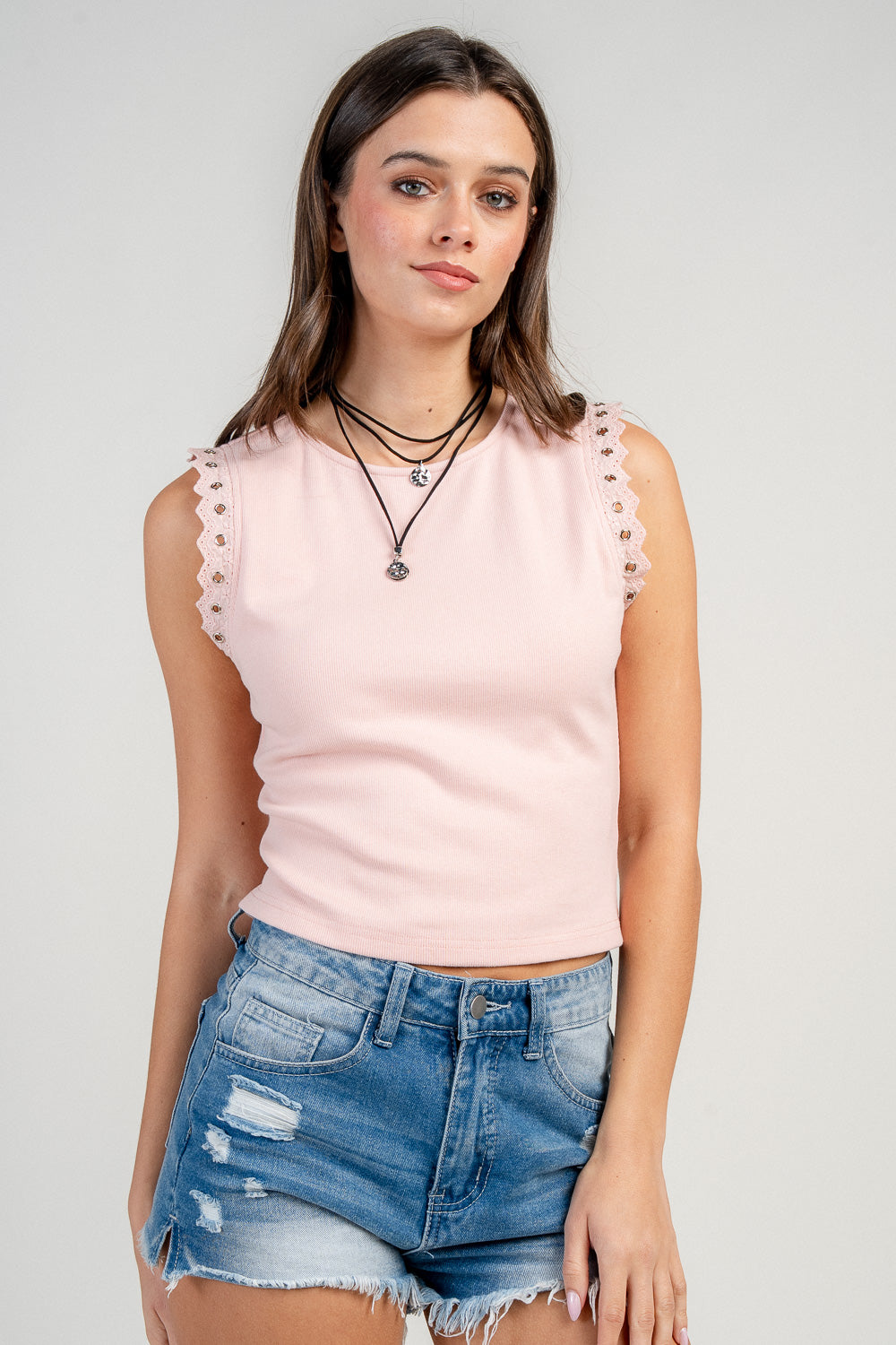 RIBBED JERSEY GROMMET EYELET LACE TRIMMED S/L RIBBED TOP